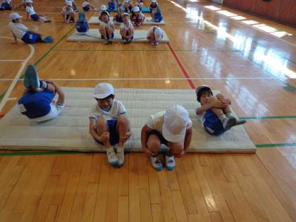 マット運動の基礎である「ゆりかご」身体をしっかりと丸めて転がり,おしりを上げるまでの運動ですが,おしりを上げることがなかなか難しく,反動や腹筋を上手に使いながら練習しています。