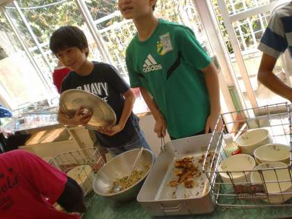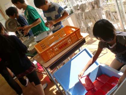 給食の片付けで,給食当番が担当のおかずや食器をきれいに片付けていました。ご飯の入れ物がとてもきれいに並べられています。入学してから毎日行っている片付けですが,こういう姿を見ると子供達の成長を実感して嬉しくなります。
