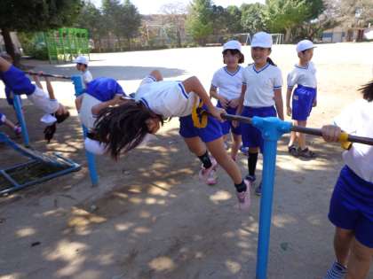 体育で逆上がりの練習をしました。補助具をつけると腰が鉄棒から離れないので,できる子もいました。練習を積んで,何もつけなくても,できるようになってほしいです。