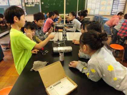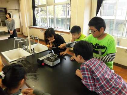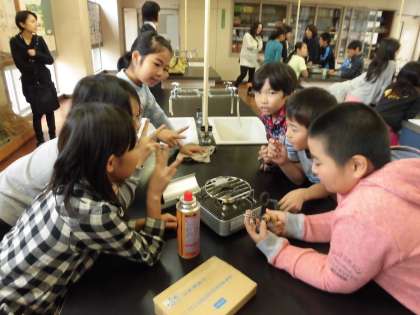 ガスコンロを使って,金属を温める実験をおこないました。実験結果が分かると歓声があがりました。ルールを守って安全にできました。