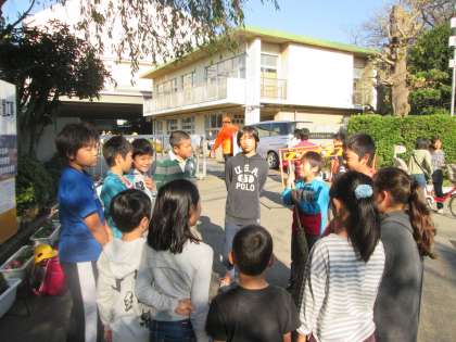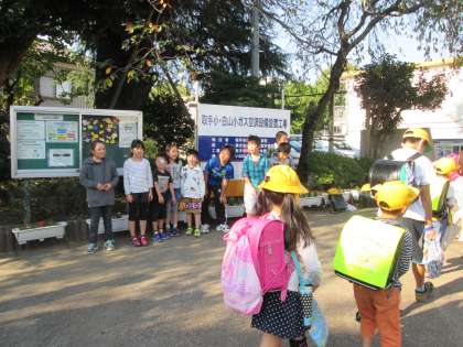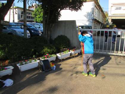 10月19日〜上学年と下学年のペアによるあいさつ運動,5年1組と2年1組にバトンタッチされました。朝から良いお天気。さわやかなあいさつの声が響きました。企画集会委員会の子供たちは,落ち葉掃きも頑張っています。