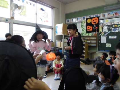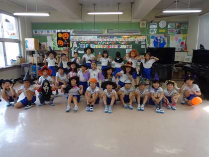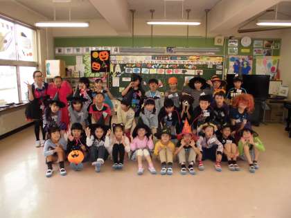 今月は10月,ハロウィーンの季節です。ですから,今日の英語はハロウィーンの変装をしました。ゴーストやコウモリになる子がいたり,魔女の帽子をかぶったりと,かわいい変装ができました。