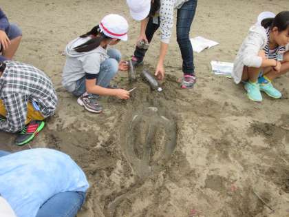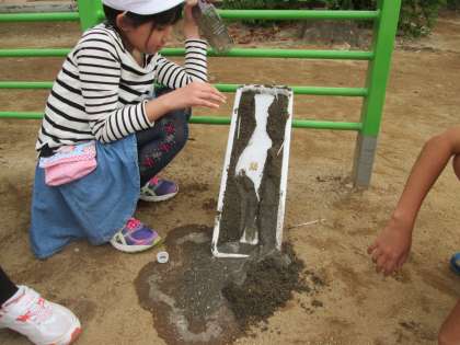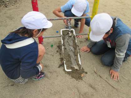 小さな川の流れをつくって,流れる水のはたらきを調べました。曲がって流れているところでは,外側は流れが速く,内側は流れが遅いことが分かりました。