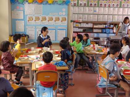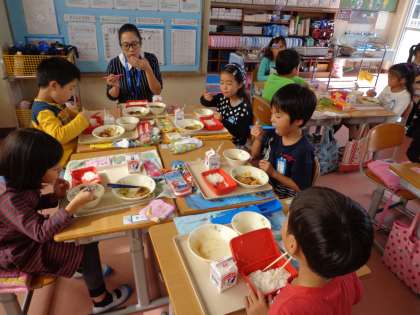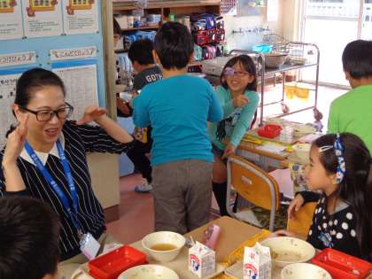 外国語活動でお世話になっているイブ先生と一緒に給食を食べました。おいしい給食をたべながら,たのしく会食ができました。