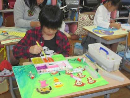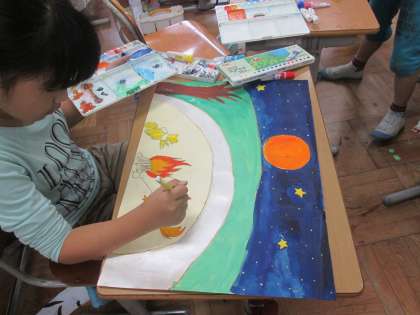 図工の時間には,自分の好きな本の物語を想像して,絵を描いています。