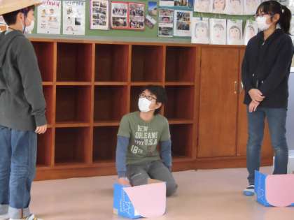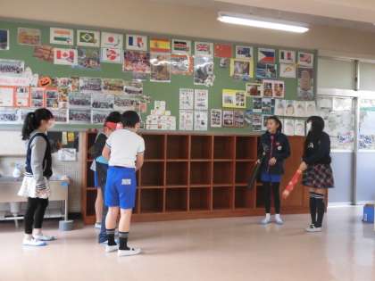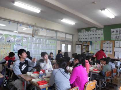 1組も2組も来週、1年生に英語で行う「桃太郎」の劇を見せます。練習をしっかりして1年生を喜ばせてあげたいですね。また、今日は給食の時にイブ先生が2組に来てくれました。楽しいランチタイムになりました。