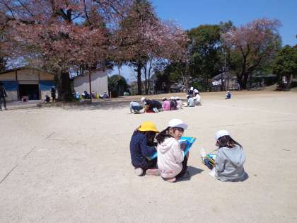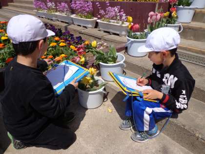 今日の生活科では,天気も良かったので,学校の中にある春を探しに行きました。桜はほとんど散っていましたが,池に浮かぶ花びらや,色とりどりの花壇の花。いちょうの木からは小さな葉っぱが出てきていました。子供達は楽しくたくさんの花を見つけることができました。