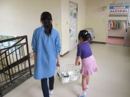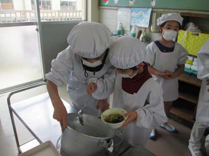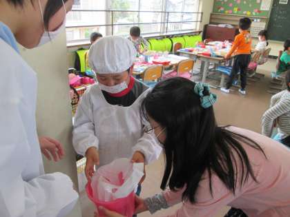 週が変わり,給食当番も変わりました。今日から1年生も一緒に給食当番を行います。1年生の目の高さに合わせて,優しく接していた6年生です。