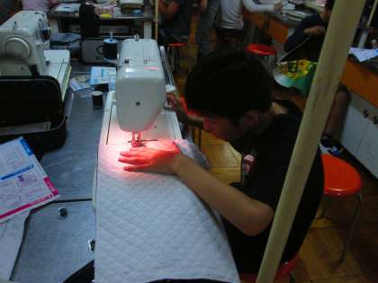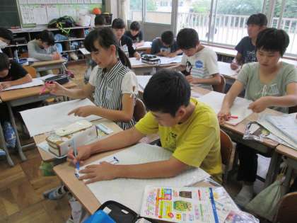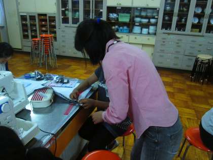 家庭科の時間,ナップザック製作を始めました。学習ボランティアで,保護者の皆様にもお手伝いいただき,世界に一つだけのすてきなナップザックを作ろうと頑張っている6年生です。