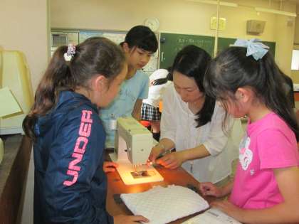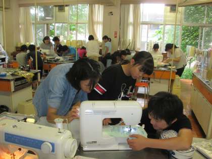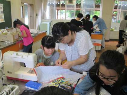 家庭科の時間のナップザック製作,学習ボランティアでたくさんのお家の方にお手伝いいただき,すてきな作品ができあがっています。全員完成するのが待ち遠しいです。