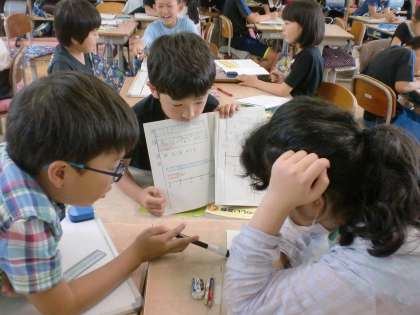 今日は机を動かして班を作り,算数の授業をしました。文章で出された問題を,テープ図で表すにはどうしたらよいか,考えています。