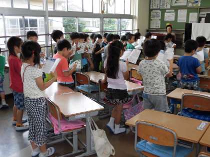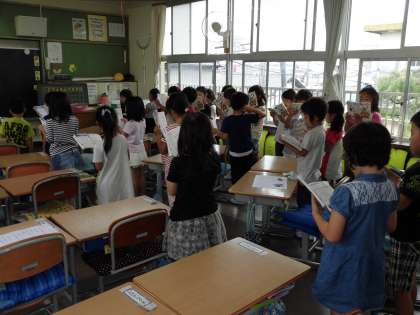 学年で歌の練習をしました。メヌエットの替え歌白山小バージョン。高い音やリズムに気をつけて歌いました。みんなで歌うと気持ちいいです。