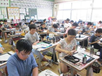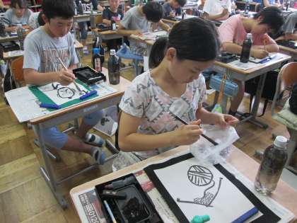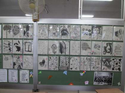 図工の時間,いろいろな方法を試しながら,墨と和紙で表しました。表し方を工夫し,すてきな作品ができました。