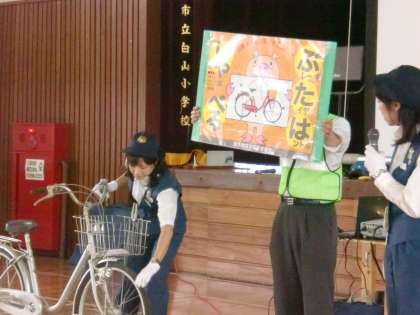 自転車の乗り方を学習しました。歩道を自転車で通行することは,13歳未満と70歳以上の人だけが認められていることや自転車の点検の仕方を教えていただきました。