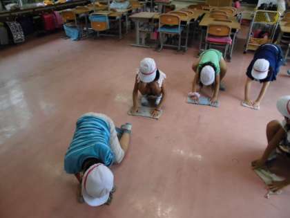大そうじの様子です。床を拭いたり,いすの裏のゴミをとったり,配膳台をピカピカに拭いたり教室中をきれいにしていました。