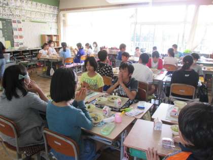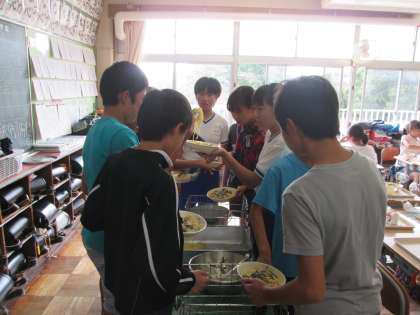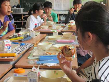 給食の時間,いつも通りおかわりの列。10月10日の目の愛護デーにちなんで,目に良いとされるブルーベリーの入ったブルーベリーマフィンを美味しそうに食べていました。