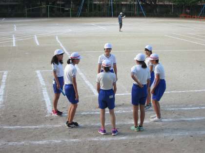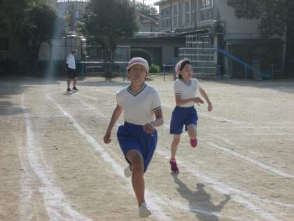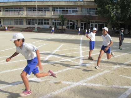 陸上の朝練習。自分達で積極的に練習を進めています。今日もやる気いっぱいの6年生です。