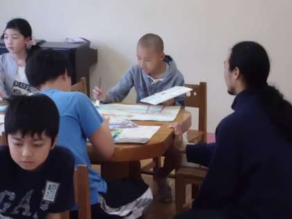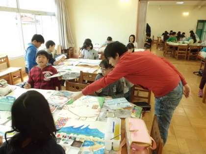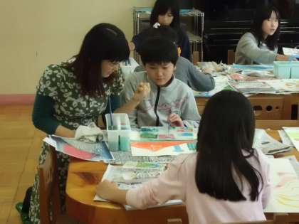 東京芸術大学より3名の学生を講師にお招きし、図工で行っているウキウキ浮世絵の着色の指導を行っていただきました。