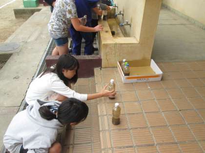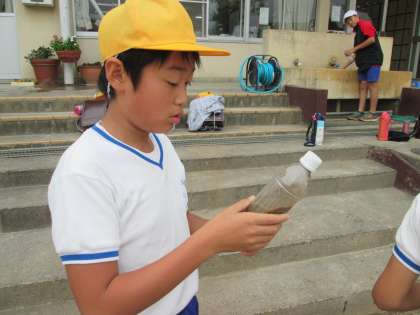 理科では,「土地のつくりと変化」の学習をしています。ペットボトルに泥,砂,れき,水を入れました。地層のでき方を調べます。