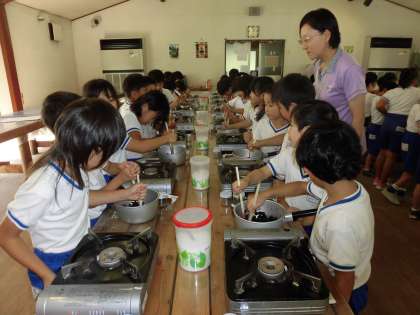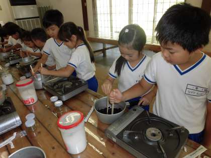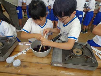 ブルーベリーのジャム作りの体験をしました。まずはつぶします。汁がはねないように慌てずにつぶしました。