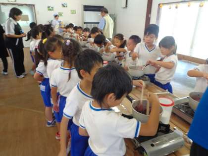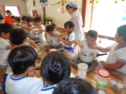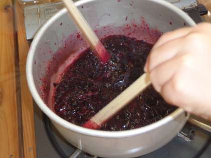 ジャム作りその2。鍋を火にかけて,焦がさないようにまぜています。