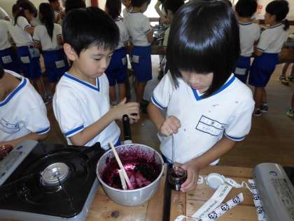 ジャム作りその3。こぼさないように慎重に慎重にビンにつめます。