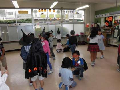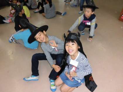今月の外国語活動は,ハロウィンにちなんだ単語を使って学習しました。イブ先生がたくさんの小物を用意して下さり,それぞれ好きな物を身に付けて楽しく活動しました。