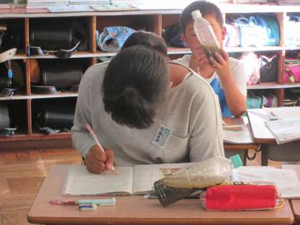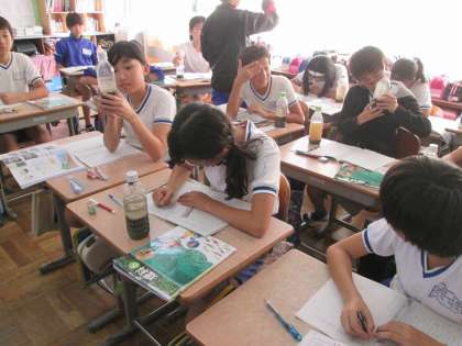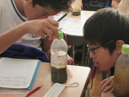理科の時間,土地のつくりと変化について学習しています。ペットボトルに水と泥と砂とれきを入れて,様子を観察しました。泥と砂とれきは層になって積み重なることが分かりました。