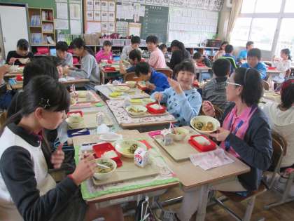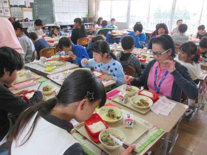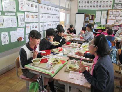 6年1組の子供たちは,イヴ先生と一緒に給食を食べました。中学校に向けての話などで盛り上がりました。6年2組の子供たちは来週一緒に食べる予定です。
