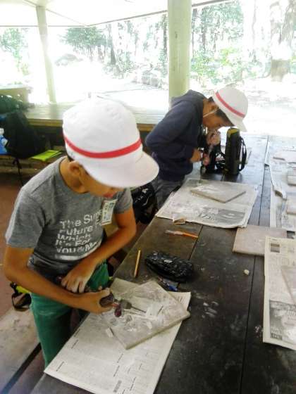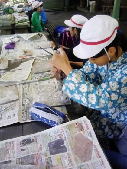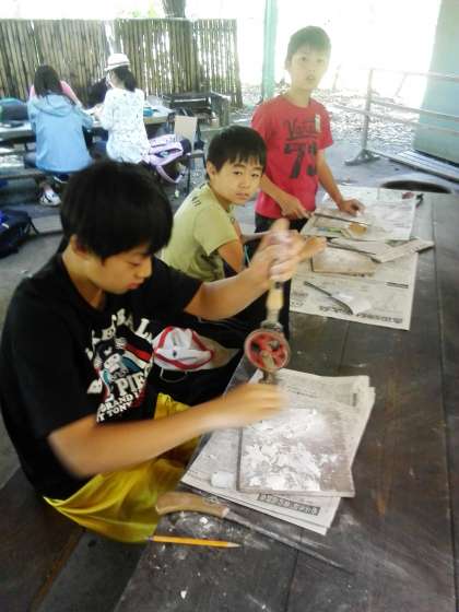 つるつるになってきたら、ヒモを通す穴をドリルであけます。真っすぐにドリルの歯をまがたまに立ててクルクルと取っ手を回します。すると穴がきれいにあきました!