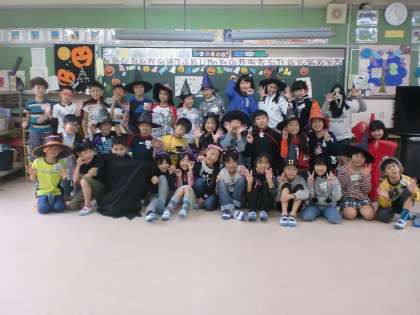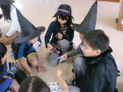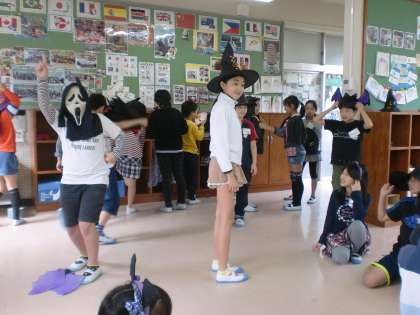 外国語活動の時間にハロウィーンのふん装をしました。毎年見ていますが,今年もかわいかったりこわかったり・・・31日にはお菓子をもらいに歩くのでしょうか。