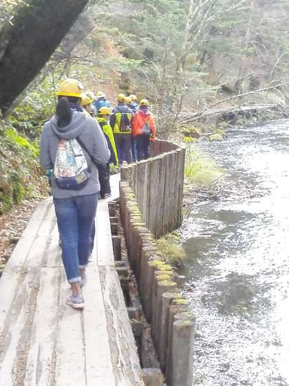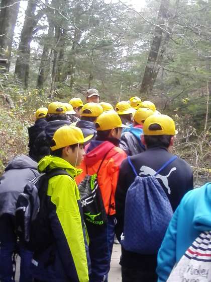 ガイドさんのお話を聞きながら戦場ケ原を歩いています。ちらっと雪もふりました。たくさんの種類の植物を見たり、カワマスを見たり、鹿の通る獣道を教えてもらったりしました。