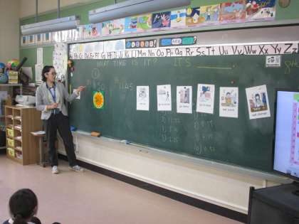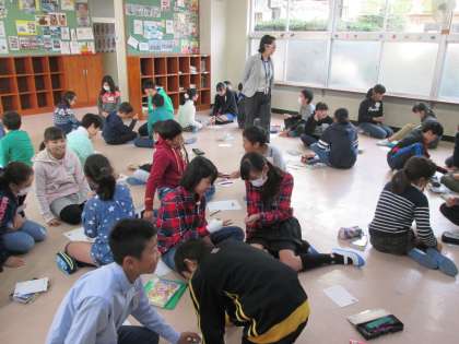 英語の時間,テーマは「世界の国々・生活」。生活の様子(起きる・学校に行く・寝るなど)や時刻を言ったり,聞いたりしました。友達とジャンケンゲームをして楽しく活動しながら,英語に親しみました。