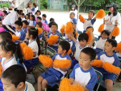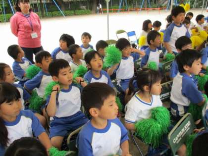 児童席では約束事を守りながら,演技の準備や応援をしています。