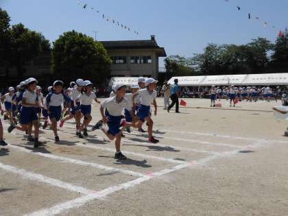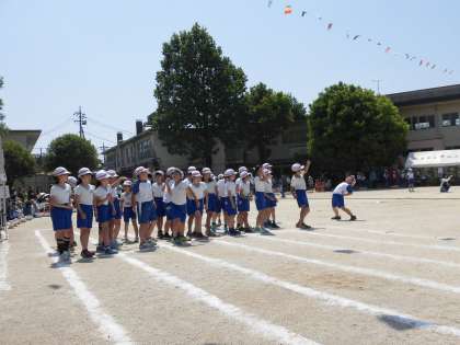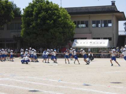 走って引っぱれの様子です。一生懸命走って,力いっぱい綱を引き合う子供たちでした。