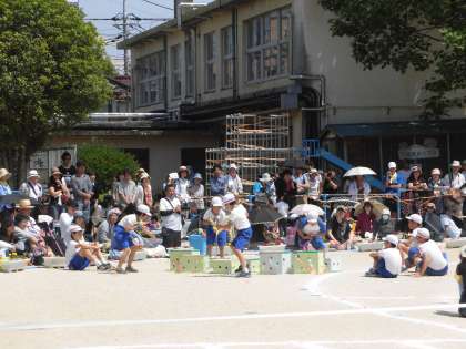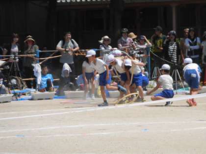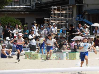 障害物競走の様子です。ながーいテープや短いテープ。引いても引いても切れないテープ。「みんながんばれ!」