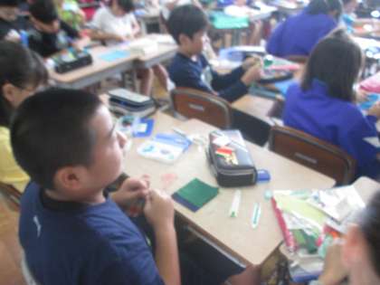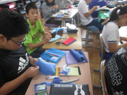 家庭科の時間に,手縫いで小物を作っています。