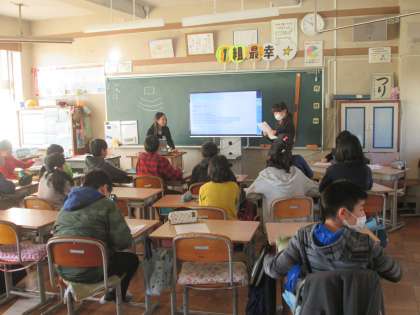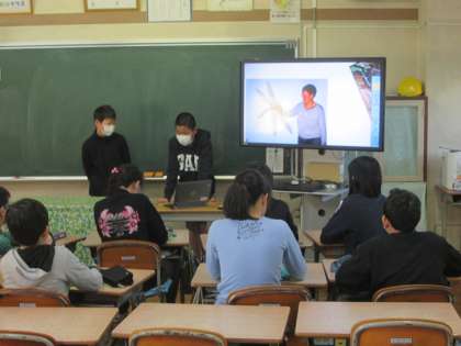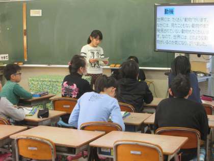 5年生に向けて世界と日本のつながりについて調べた内容を発表しました。パソコンを使って効果的に伝えることができました。