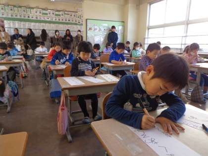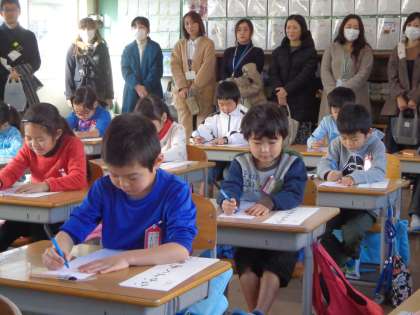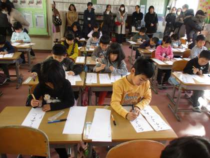 書き初め大会が行われました。姿勢を正し,心を落ち着けて,丁寧に,のびやかに書くことができました。