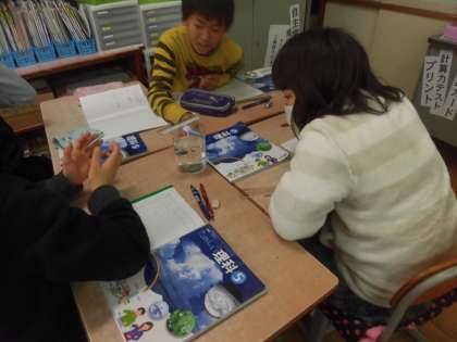 理科では水溶液の性質について学んでいます。今日は氷砂糖やコーヒーシュガー,食塩を水に溶かしてみました。氷砂糖からもやもやが下におりていく様子(シュリーレン現象)などを興味深く観察しました。そして不思議に思ったこと,これから調べたいことなどをノートに書きました。