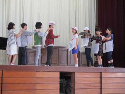 今週の木曜日にある1年生をむかえる会の練習です。5年生は初めての集会の運営となります。始めの言葉や終わりの言葉,じゃんけん列車のお手本を見せます。胸に何年生の役なのかを下げて演技をします。1年生に分かるように演技できるように練習しています。