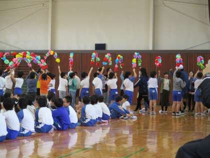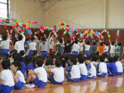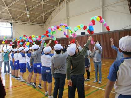 5年生は1年生をむかえる会でアーチを担当しました。1年生と手をつないだ6年生が通るので,高く上げなくてはならず,結構大変です。でも1年生のためにがんばりました。