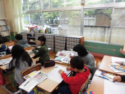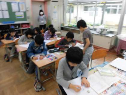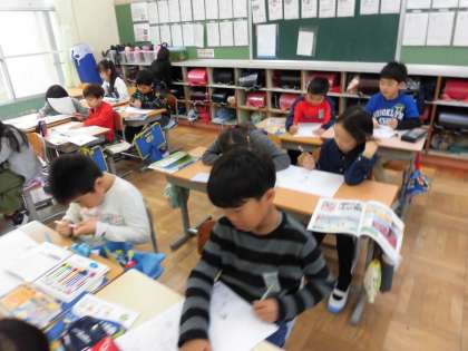 学校でのうれしかった気持ちを絵にします。真剣なまなざしでがんばっています。