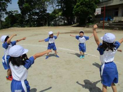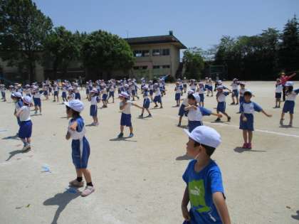 ダンスの練習を外で行いました。円になるなどの隊形移動,入場や退場のやり方も練習しました。暑い日だったので,最後の先生のお話は木陰で座って聞きました。