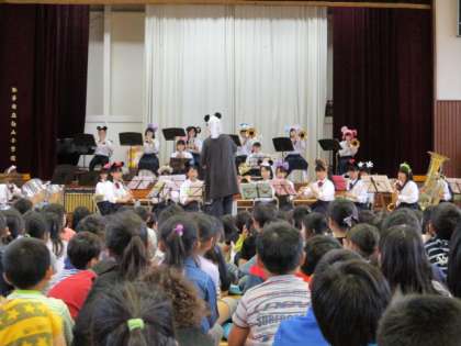 取手二中吹奏楽部が演奏へやってきてくれました。クイズ形式の楽器紹介には,たくさんの挙手がありました。みんなの知っているすてきな音楽に聞き入りました。
