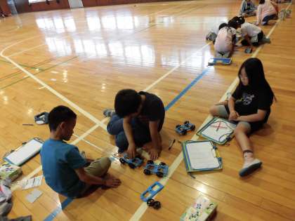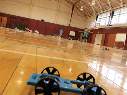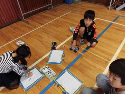 ゴムの力とものの動きの関連性を車の実験器具を使って調べました。自分の車を使ってやる気いっぱいです。