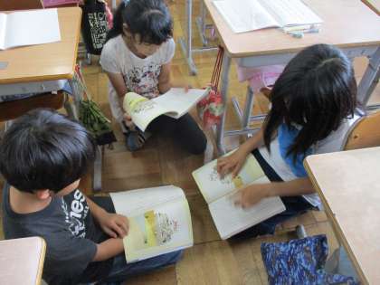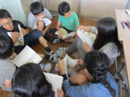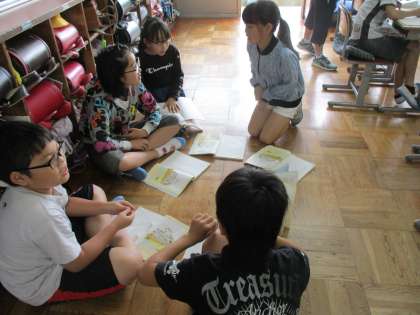 物語の学習では,お話の山場のどこで主人公の気持ちが変わったと分かるのか話合いました。ここで変わったとはっきりと分かる一文を見つけます。クライマックス読みと言います。子どもたちがこれだと思った一文の候補は5つありました。それぞれのチームに分かれて,なぜここだと思ったのか話合いました。