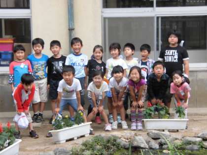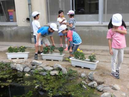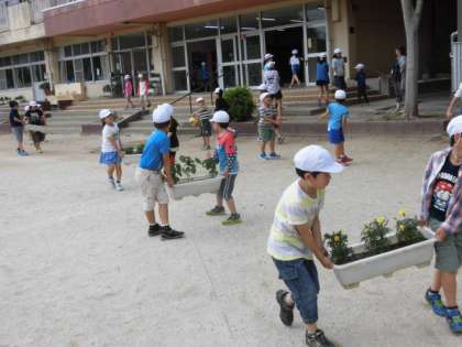 園芸美化委員会からの呼びかけで,プランター運びの仕事を手伝いました。二人一組になって重いプランターを持ち,ビオトープの周りに置きました。ビオトープがお花できれいになりました。