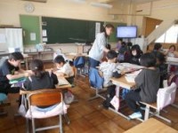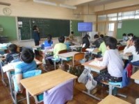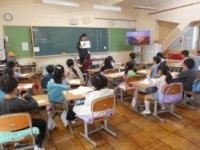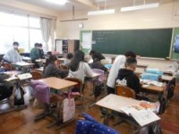 4校時、2年2組は音楽です。まず、「ぷっかりくじら」を元気よく歌う声が下の階まで聞こえました。本時の課題は、「身の回りの音を探してみよう」近所で聞こえた音をタブレットでまとめて、先生に提出する活動をしていました。「カードが2枚になった」、「カードが見当たらない」などを解決しながら、タブレットでまとめたカードを提出しました。最後に、タブレットで全員のカードを見て、自分とおなじものを探していました。タブレット遣いが、どんどん上手になっています。2年1組は図工です。課題は、「大きく育て、びっくり野菜」好きな野菜を大きく描いて、その中に建物を描きます。本時は、下描きです。「何を描いたらいいかな」と周りを見ながら考える子、自分でどんどん進める子、とても積極的です。モニターに映しだされる仲間の作品を参考にしながら、熱心に描いていました。本番は大きな画用紙に描くというので、皆張り切っていました。