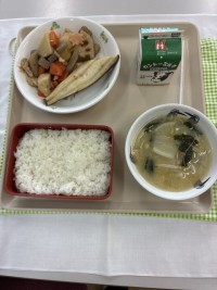 麦ごはん、さんまの蒲焼き、切り干し大根の煮物、かにかま汁です。